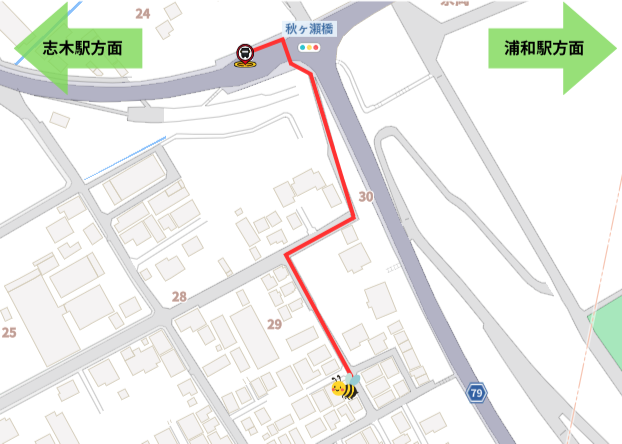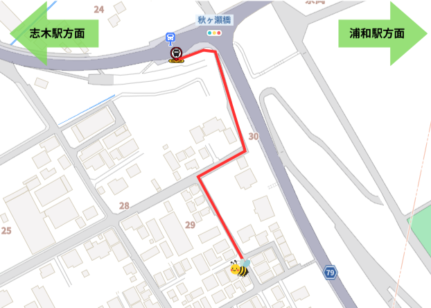 志木駅東口から 国際興業バス【志01 浦和駅西口ゆき】のバスに乗車し、秋ヶ瀬橋で下車