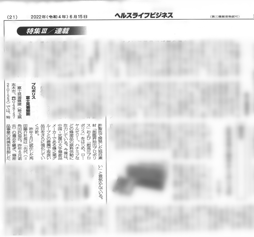 ヘルスライフビジネス 2022年6月15日 第781号に富士見養蜂園「プロポリス」の記事が掲載されました。