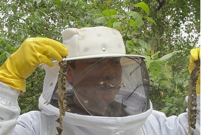 頭からつま先まで完全装備で挑んだものの、防護服のすき間から入ってきたミツバチに何か所も刺されながら、必死で原塊を採集しました。