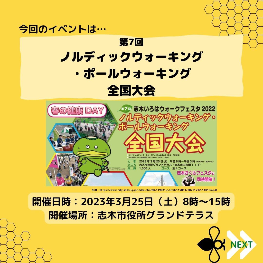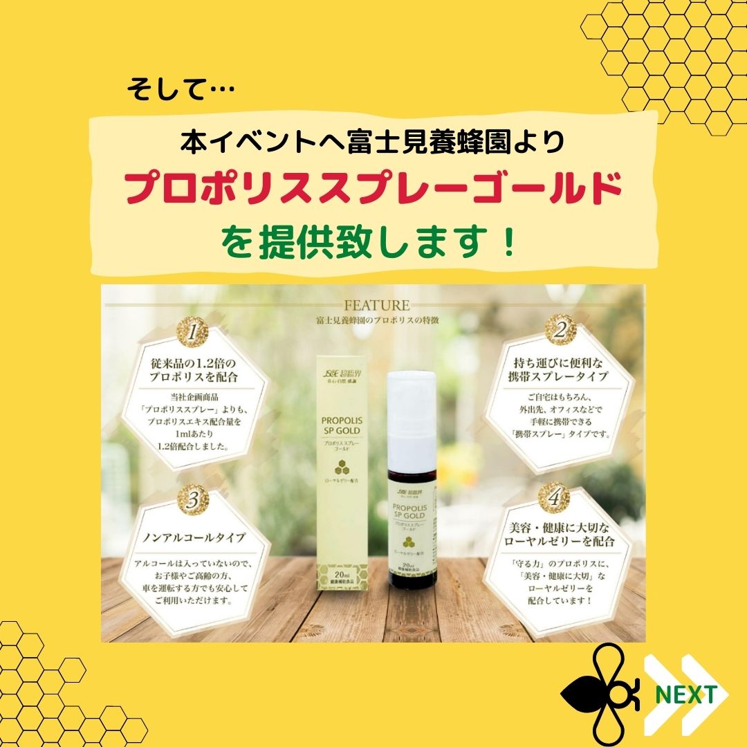 2023年3月25日(土)に志木市市役所主催で開催予定の「志木いろはウォークフェスタ2022 ノルデステックウォーキング・ポールウォーキング全国大会」に富士見養蜂園の「プロポリススプレーゴールド」を参加者の皆様にプレゼントとして、協賛をさせて頂きました。(詳細については、志木市関連ホームページをご覧ください。)