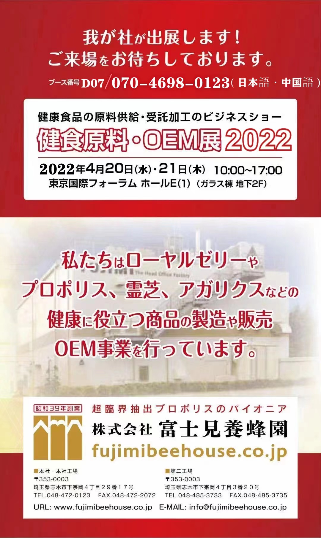 この度、4月20日(水)・21日(木)に開催されます株式会社ヘルスビジネスメディア主催「健食原料・OEM展2022」に、弊社 株式会社富士見養蜂園が出展することとなりました。