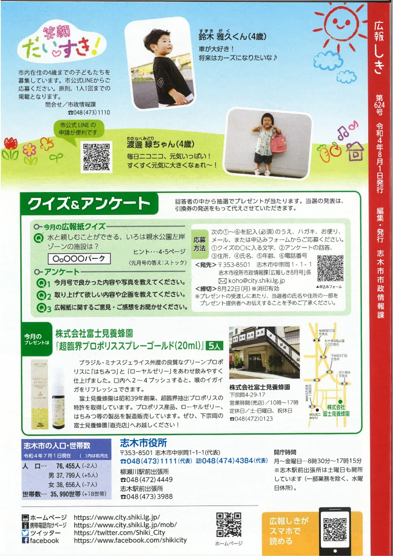 広報しき8月号『クイズ&アンケート』コーナーで「超臨界プロポリススプレーゴールド」が今月のプレゼントとして掲載されています。