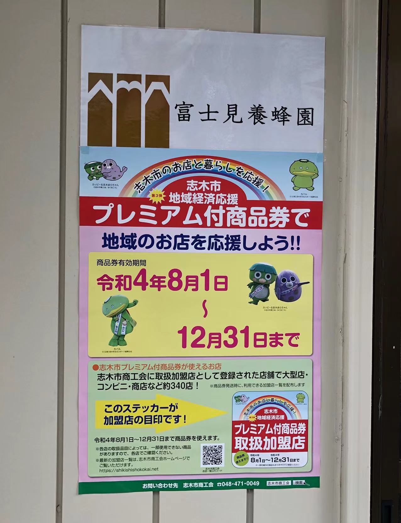 富士見養蜂園直売店では、志木市プレミアム付商品券を使えることになりました!